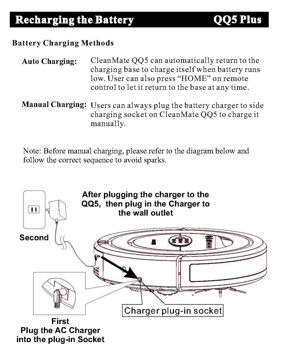 11. Where to place Self-Charging Station to make it easier for the QQ5 to find it? Having the Self-Charging Station in a place where there are a lot of objects will make it harder for the QQ5 for find it. For better QQ5 searching performance, place the Self-Charging station at the central location of your house or a location that has open space. We recommend placing the Self-Charging station next to a wall leaving space of at least 15" from the each side of the charging station. Also do not place it at corners or edgy places.12. How does QQ5 search for Self-Charging Station? QQ5 series have implemented a new docking technology, so its base signal is much stronger and covers a much larger area than QQ2 and QQ3 series. CleanMate QQ5 will be able to detect base signal from very far distant (up to 20 ft away), and then go directly back to the charging base without further searching. Therefore, the docking time of QQ5 is much shorter and affective. The video below shows how QQ5 Plus finds its charging station in no time. 13. How to save timer setting on charging station? Charging station clock and scheduler setting will be saved when AC power is lost. Clock and timer data will be restored when charging station has AC power. 14. How to set up clock and scheduler setting on charging station? Please refer to Scheduler Operation Section on user manual. 15. How to detect when the dust bin is full and when to empty debris inside dust bin? You need to check dust bin debris level when one cleaning cycle is finished. Please empty dust bin and clean air filter as often as possible. There is no harm to run QQ5 even the dust bin is full. QQ5 will no longer pick up debris or it will lost vacuum power when dust bin is full or filter is very dirty. 16. Why do I see sparks when I plug in AC power to charging station? First connect DC output to charging station first and plug AC charger to wall outlet last. 17. Will having the UV light on shorten QQ5 unit running time? It will not impact QQ5's running time too much. QQ5 UV light helps to disinfect and clean better. The UV light is automatically turned on at the scheduling vacuum time. QQ5 can clean carpets that are thick up to 1/2". QQ5 can climb up 1/2" carpet. It will not go over rug with tassels since the roller brush will not do reverse action like Roomba unit.